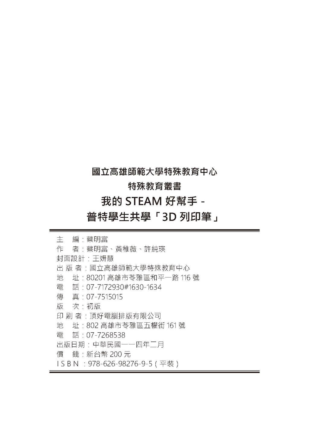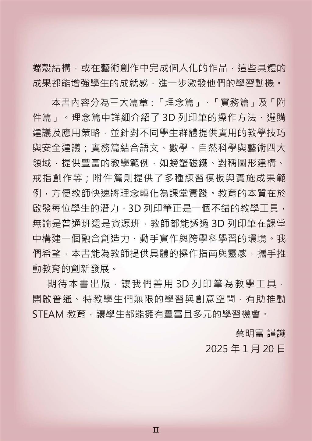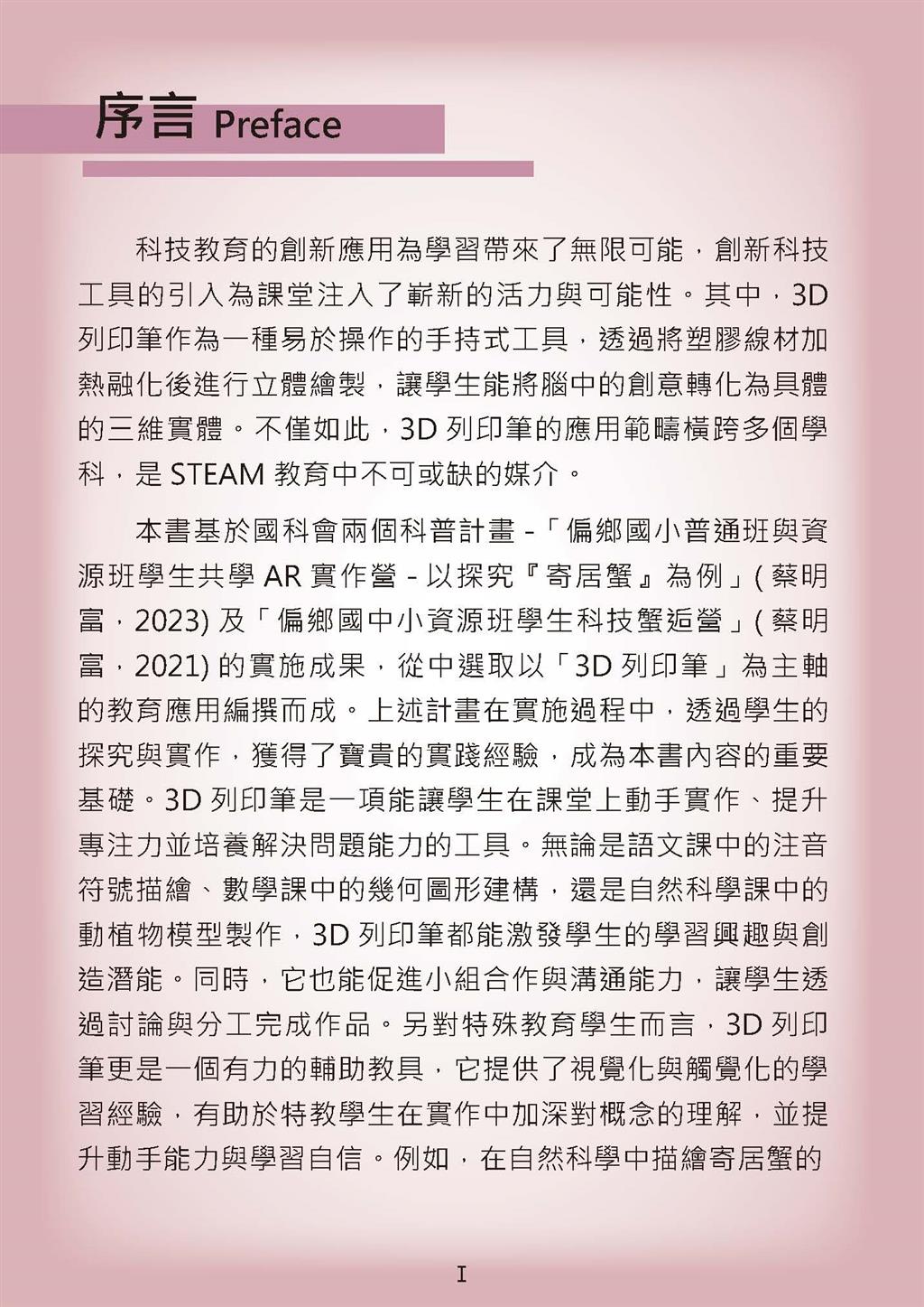 本書以「3D 列印筆」為核心,探討其在科技教育與 STEAM 教學中的創新應用與實踐成果。3D 列印筆是一種可將塑膠線材加熱融化、進行立體繪製的手持工具,能協助學生將創意轉化為具體的三維作品,培養動手實作與解決問題的能力。書中內容源自國科會兩項科普計畫—「偏鄉國小普通班與資源班學生共學 AR 實作營」及「偏鄉國中小資源班學生科技蟹逅營」,累積了豐富的教學實踐經驗。全書分為「理念篇」、「實務篇」與「附件篇」三部分:理念篇介紹3D列印筆的操作、選購與應用策略;實務篇結合語文、數學、自然科學與藝術等領域,提供多樣化教學範例;附件篇則收錄練習模板與成果展示。3D列印筆不僅能激發學生的創造力與學習動機,促進合作與溝通,更能作為特教學生的輔助教具,提供視覺與觸覺兼具的學習體驗。期望本書能成為教師推動創新教學的重要資源,開啟融合創造、實作與跨域學習的教育新視野。