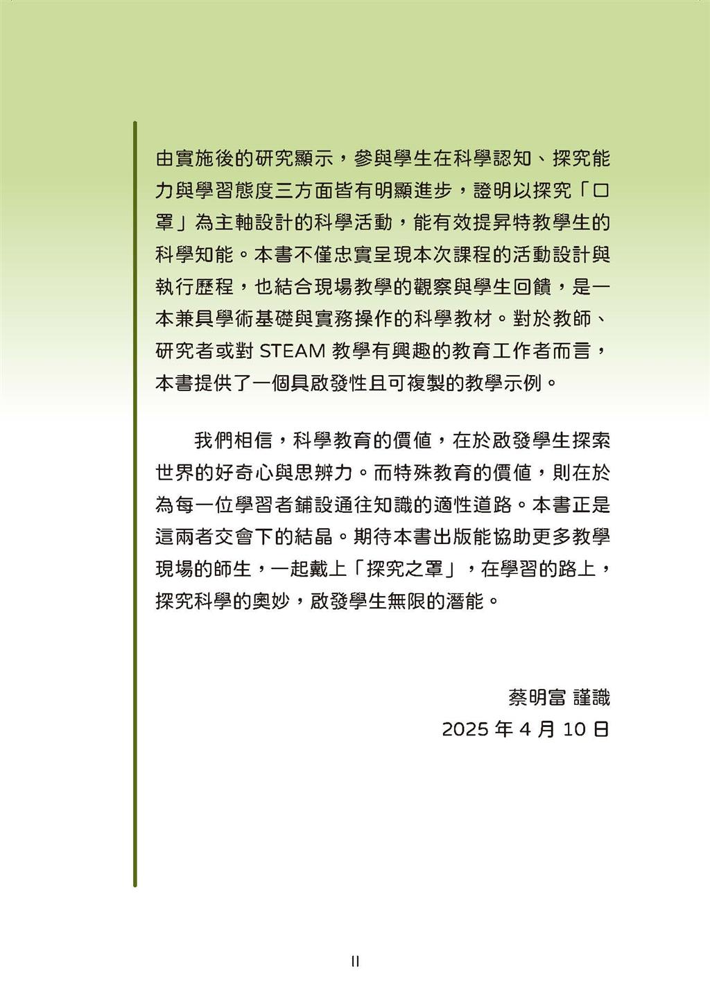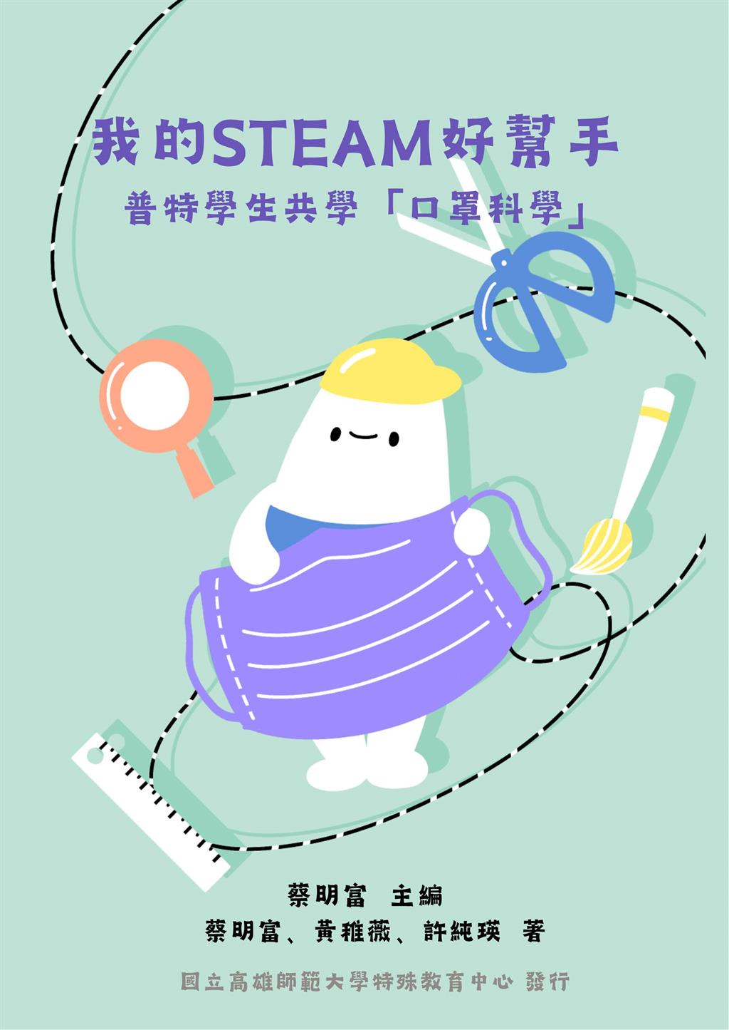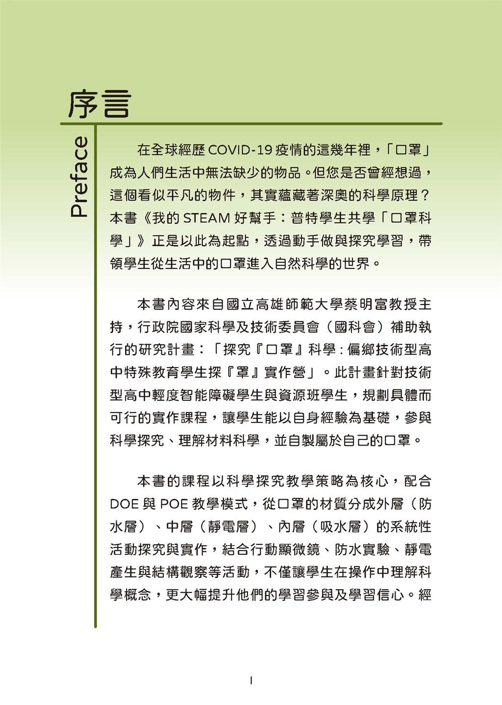 本書《我的STEAM好幫手:普特學生共學〈口罩科學〉》以日常生活中常見的「口罩」為主題,結合探究式與實作導向的教學策略,帶領學生從生活經驗出發,進入科學與材料的學習世界。內容源自國立高雄師範大學蔡明富教授主持、國科會補助的研究計畫「探究『口罩』科學:偏鄉技術型高中特殊教育學生探『罩』實作營」。課程以科學探究為核心,運用DOE與POE教學模式,從口罩三層結構—外層防水層、中層靜電層、內層吸水層—設計出系統性的實驗與活動,如顯微觀察、防水與靜電測試等,讓學生在動手實作中理解科學原理。研究結果顯示,參與學生在科學知識、探究能力及學習態度方面皆有顯著提升。全書完整呈現課程設計、教學歷程與學生回饋,是融合學術與實務的STEAM教材典範。此書不僅適用於特殊教育現場,也為一般教師與教育研究者提供具啟發性、可複製的教學範例,展現科學教育與特教結合的創新價值。