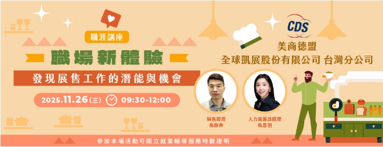 活動日期:11/26(三)09:30-12:00 活動地點:高雄市前金區五福三路21號8樓-青年職涯發展中心 活動主持人:美商德盟全球凱展股份有限公司 台灣分公司 人力資源部經理/吳恩羽、展售經理/吳修齊