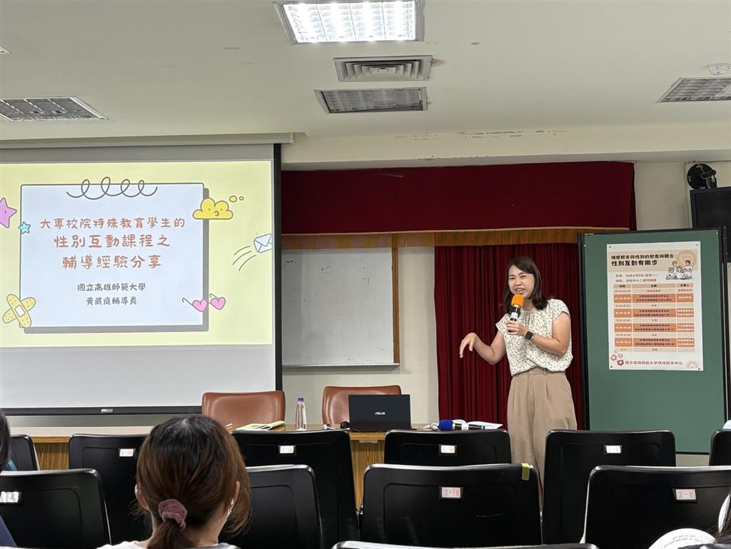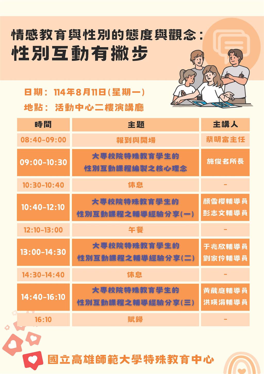 本中心蔡明富主任邀請樹德科技大學人類性學研究所施俊名所長、義守大學資源教室顏雪櫻輔導員、正修科技大學特殊教育資源中心彭志文輔導員、國立成功大學資源教室于兆欣輔導員、正修科技大學特殊教育資源中心劉家伶輔導員、國立高雄師範大學資源教室黃葳庭輔導員、正修科技大學特殊教育資源中心洪瑛涓輔導員擔任講師,旨在深化大專校院資源教室輔導員對情感教育與性別議題的認識,增進其在輔導學生時對性別互動與情感發展的敏感度與專業應對能力,以利協助特殊教育學生學習健康的人際界線與適當的情感表達方式。此研習課程辦立於國立高雄師範大學,共有59人報名參加、錄取59人、實到41人。