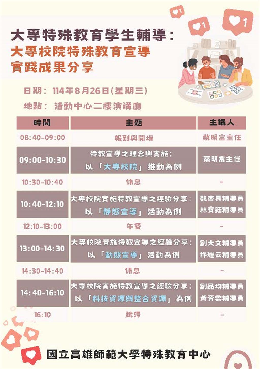 二、地點:國立高雄師範大學(和平校區)活動中心二樓演講廳。