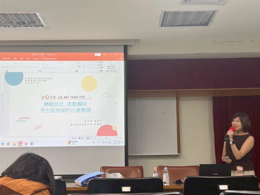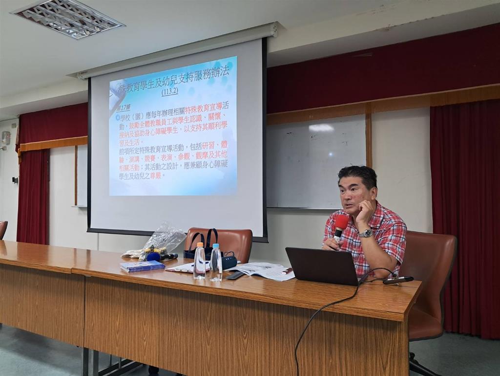 第一堂課由蔡明富主任分享「特教宣導之理念與實施:以『大專校院』推動為例」。蔡明富主任先引導輔導員們進入高師特教中心的情閉網站,實際操作AR觀看社會技巧教材,體驗新科技融合特殊教育的時代趨勢。接著進入主題「看見差異、理解特教:大專校院特教宣導的推動」,首先提及台灣已通過「CRPD施行法」,進一步影響特殊教育法。CRPD八大原則讓通用設計在生活中越來越普及;另一個CRPD重要的概念為「合理調整」,保障身心障礙者應有的權利。近年特殊教育及幼兒支持服務辦法修法後,「特殊教育宣導活動」受到重視,特教宣導活動含各種不同的形式,包含:研習、體驗、演講、競賽、表演、參觀、觀摩等。經過研究,身障者本身的「社會技巧」影響周遭的人對其接納的程度。高師特教中心以設計從學前至大專社會技巧的課程,主任鼓勵各校善用教材資源,並與高師特教中心交流,將提升社交技巧的課程帶給需要的學生。特教宣導很重要的目標為消除對身長障者的刻板印象、偏見與歧視,而除了對外宣導障礙特質,障礙個案本身也要有所改變,雙向提升,才能成功營造健康接納的環境。主任分享關於ADHD接納、排斥研究發現,以及態度改變的學習理論,並將整合了特教宣導相關資源的網站分享給在場的輔導員。接續分享大專校院特教宣導的推動方向:(1)提供適切說服訊息。(2)運用AI執行特教文宣。(3)善用AI形成特教示範影片。(4)採用Thing Link製作宣導教材。主任亦實際呈現實用的AI生成軟體與AI生成的文宣、VR影片成果、ThinkLink網站等科技運用實例,供輔導員們參考。
