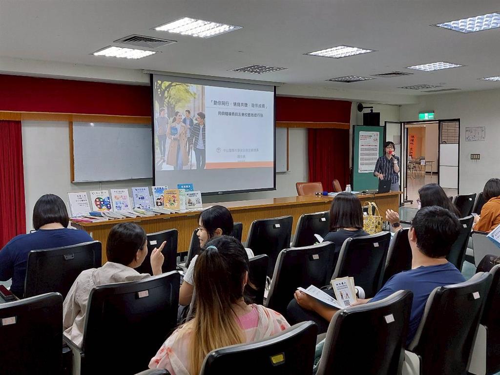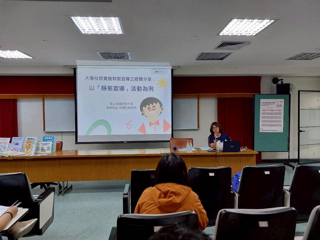 第二節課由魏杏真輔導員與林寶鈺輔導員分享「大專校院實施特教宣導之經驗分享:以『靜態宣導』活動為例」。首先由魏杏真輔導員分享同儕輔導員與友善校園推廣行動。中山醫學大學資源教室設有「同儕輔導員」的機制,擁有完整的招募以及專業培訓的流程,有嚴謹的篩選機制。同儕輔導員的培訓重點有:「隱私意識」、「責任感」、「參與」、「志願服務」;整體活動籌畫與流程設計為:(1)特教生的需求評估。(2)學生招募與媒合。(3)講師邀請與課程設計。(4)活動實施與成效追蹤。而資源教室同步辦理「友善校園講座」與「輔具操作體驗」,這些活動有助於一般生透過活動從理解到感同身受。第二部分由林寶鈺輔導員分享高師大資源教室的靜態宣導,有兩個主要活動:「特教心劇院」與「特教FUN映館」。特教心劇院活動內容為:(1)放映宣導障別的電影,(2)簡報障礙特質、協助方式,(3)特教學生現身分享及座談交流。林寶鈺輔導員播放近年的成果影片,讓現場輔導員對活動進行更有概念,並提醒幾項挑選電影時的相關原則、邀請分享學生的協助準備以及場地準備與活動宣傳的注意事項。而特教FUN映館的內容為:(1)障礙迷思問答,(2)協助方式及情境演練,(3)障礙名人或優勢介紹。與電影不同,林寶鈺輔導員呈現歷年教材,說明特教FUN映館教執行方式以及背後的準備。