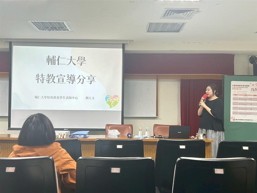 第四節課由劉品均輔導員與黃資雲輔導員分享「大專校院實施特教宣導之經驗分享:以『科技資源與整合資源』為例」。首先,劉品均輔導員介紹了大仁科技大學的資源教室成員,輔導員提到從入班宣導慢慢推動到全校的CRPD宣導,讓更多人認識特教;班級宣導部分,輔導員會詢問班級是否有入班宣導的需求,根據需求設計分組活動與簡報;此外,在校園博覽會與校慶時進行特教宣導,輔導員設計了四個易拉簡報與桌巾,並與餐飲科學生擺設章魚燒攤位,設計闖關活動:與你最速配,設計四種輔具與障別的配對,可以根據學校調整障別,在設計文宣品時,輔導員提到可以利用手拿板、打卡版、直立式易拉桿,都是可以重複利用,也能放在中心外讓路過民眾觀看,另外還有直立式桌曆卡,上面印製宣傳內容並附上中心QRcode,輔導員也有提到參考衛福部的資料設計手冊,在入班宣導時發放宣傳,並且印製CRPD教育人員宣導手冊提供給導師與任課教師使用;第二部分,黃資雲輔導員介紹了國立臺北教育大學與教育部合作推動考生服務隊活動,原在台北的淡水考場位於山坡中央,並且長年下雨,對於身障考生相當不便利,因此在經過考量之後,教育部決定在國立臺北教育大學設立考場,第一年接受40位腦麻考生,因為成效不錯,第二年增加了自閉症考生以及藝術術科,為了解決困難,因此有了考生服務隊,在活動籌畫過程中,首先要招募報名,需要30名人力,由於考試橫跨四天,因此除了教務處的宣傳外,也會請助教幫忙,人力資源取得後,要安排各種事項(人力安排、特殊考場、服務台人員、試場位置圖),第二步是教育訓練,在考試的前兩個禮拜舉辦,利用簡報、影片、腦經急轉彎(曾經發生過的個案)、實務演練讓人員了解會遇到的障礙類別以及會遇到的輔具,並且知道在遇到問題時,可以求助於身後的體系,而不是全部都要自己負責。人力安排會根據功能編組,例如通常會安排特教系與心諮系的人員在服務處幫忙回答家長問題,隊長部分會由一位資源教室人員在試場,一位資源教室人員在家長服務區,一位校內行政人員在試場機動。輔導員提到,四天主要都是利用通訊軟體聯繫,在各節考試中提醒人員,每一天晚上也會為人員打氣。
