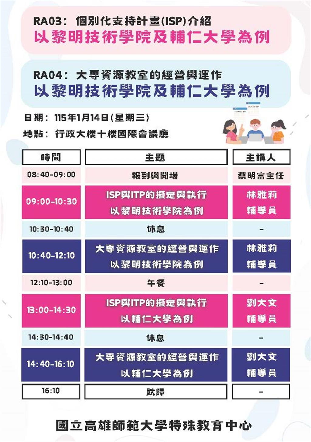 一、時間:115年1月14日(星期三)09:00-10:30、13:00-14:30。