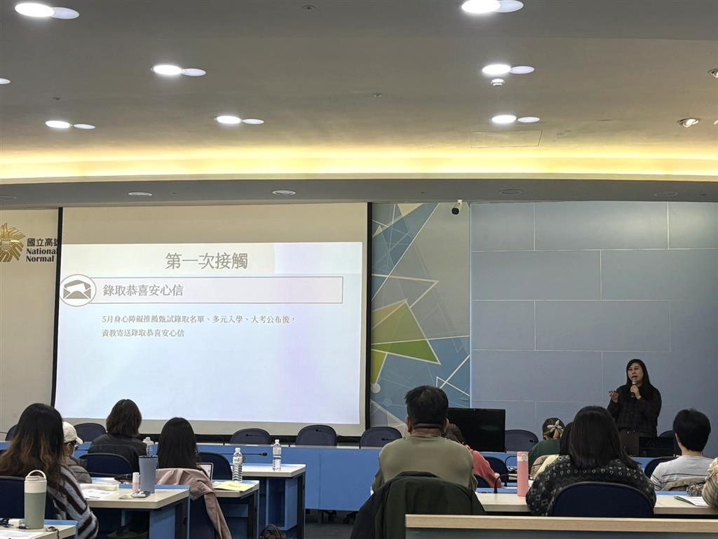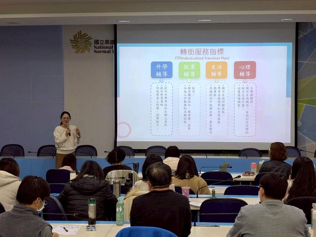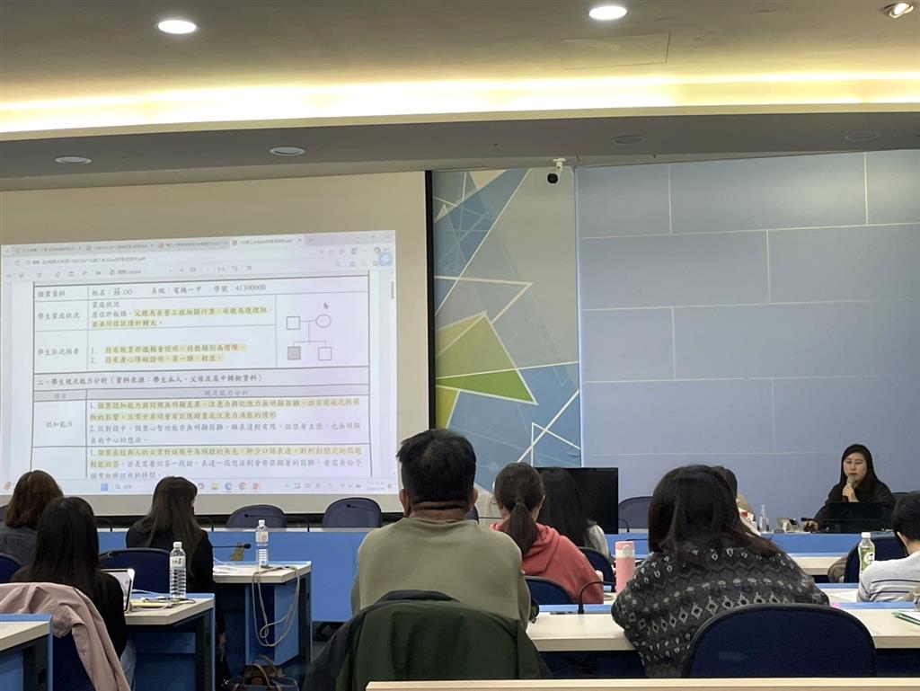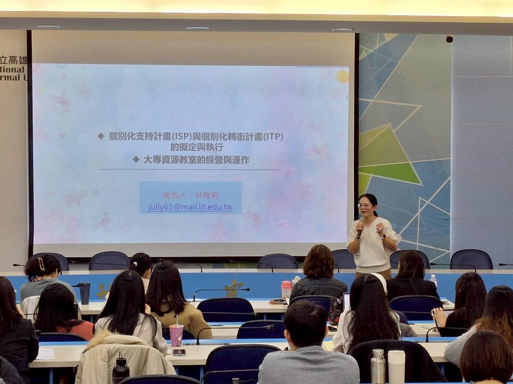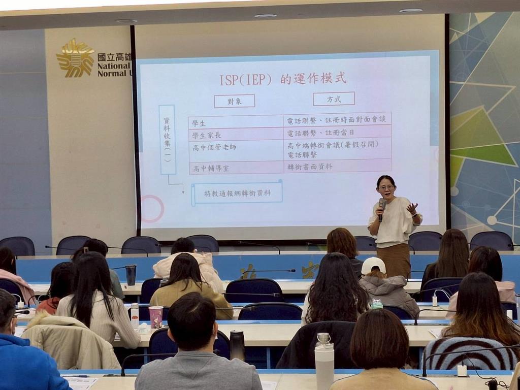 第一堂課由林雅莉輔導員針對ISP與ITP分享實務經驗。首先強調每間學校學生的障礙類別與需求都不同,黎明技術學院的經驗僅作參考,而後分析了目前黎明技術學院校內特殊生的分布概況,佔最大比例的為學習障礙、智能障礙與自閉症,並分享了一些實務案例。林雅莉輔導員鼓勵輔導員們與學生班導師合作,蒐集學生資料,也增進學生與班導師互動的機會。為應對龐大的輔導需求,資源教室建立一套完整的三大支持服務脈絡:導師、各系義務輔導老師、認輔制度老師。ISP的運作模式如下:(1)資料蒐集:透過與學生、家長及高中端老師的聯繫,完整匯集學生的能力現況與需求評估。(2)會議由系主任、導師、任課老師及個管老師共同召開,針對新生或有需求的學生擬定支持策略,並在每學期初定期召開修正會議。(3) 每一位學生的ISP決議,任課老師都會收到。接續進行ITP說明,在轉銜輔導的過程中,要提早和學生討論畢業後的方向,轉銜服務指標涵蓋升學、就業、生活及心理四大輔導面向。在職涯輔導方面,學校規劃了四個階段的成長路徑:從大一新生的「生涯探索」開始,利用UCAN平台及生涯牌卡進行評估;大二至大四期間進行「生涯規劃」,舉辦工作坊與講座;隨後進入「實務增能」階段,提供個別諮詢、企業參訪與模擬面試;最後則是「資源整合」,安排校內外實習並連結新北市勞工局的就業轉銜服務。特別是在資源整合上,資源教室對內連結各系所資源與研究發展處,對外則與社會局、勞工局及各障礙協會合作,提供輔具、長照或職前適應等全方位協助。林雅莉輔導員分別就各階段輔導分享活動實例,這些活動與措施,是希望能提升特教學生的職涯競爭力。