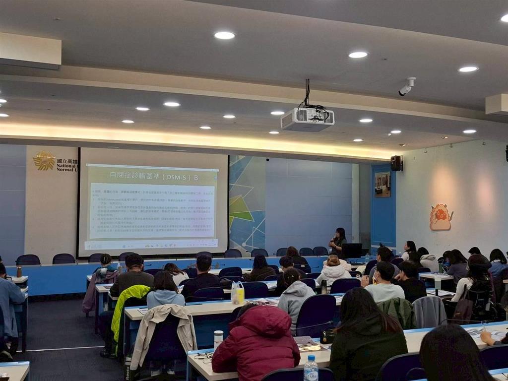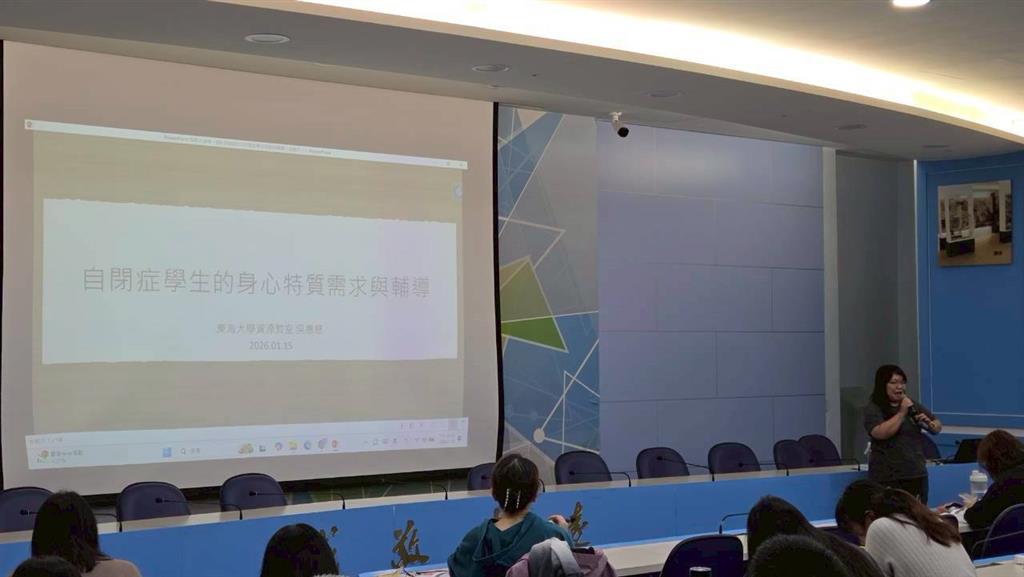 二、第一堂課由吳惠慈輔導員分享自閉症學生的身心特質與輔導實務。首先從觀點面對學生當面進行講解,從醫學觀、社會觀及神經多樣性等不同觀點理解自閉症學生,將影響教師與輔導人員對學生的教學與支持方式。在自閉症的鑑定準中指出應在多重情境下出現社交溝通與人際互動困難、侷限且重複的行為或興趣,以及感官敏感或遲鈍、注意力易受感官刺激影響,且這些特質通常在早期即出現,並於學業、社交及未來職涯上造成顯著影響。在自閉症學生的特質中分為四個面向(1)認知與行為表現上,自閉症學生多以具體、線性方式思考,常具備特定優勢能力,並能高度專注於感興趣的事物,但在抽象思考與情境理解上相對較為困難。(2)溝通能力方面其溝通表現可能出現語言能力不足或語言使用獨特的情形,並較難判斷人際互動情境;(3)社會情緒,則常見社交互動困難、情感表達特殊,(4)感官動作方面以及感官過度敏感或遲鈍、動作協調不佳等現象。接著介紹自閉症學生常面臨的困難,包含生活適應、學習表現、人際心理及生涯發展等層面,於大學階段尤以住宿生活、室友互動及課程選擇與學習態度的調適最為明顯。針對輔導原則與支持策略,建議從學習支持、生活協助、心理支持及資源整合等面向著手,透過與學生討論其自身困難,共同思考解決方式,並了解學生對支持的期待。在實際輔導互動中,應以生活適應相關議題為優先切入點,再逐步延伸至其他問題的討論,並以具體、明確而非過於開放的提問方式引導學生思考。整體輔導目標在於協助學生發展良好且可行的因應策略,使其逐步適應並穩定成長。最後,輔導人員應善用既有資訊、注重資源與輔導目標的連結,並透過團隊合作提供支持,同時欣賞新世代學生的多元生存方式,看見其特質與優勢。