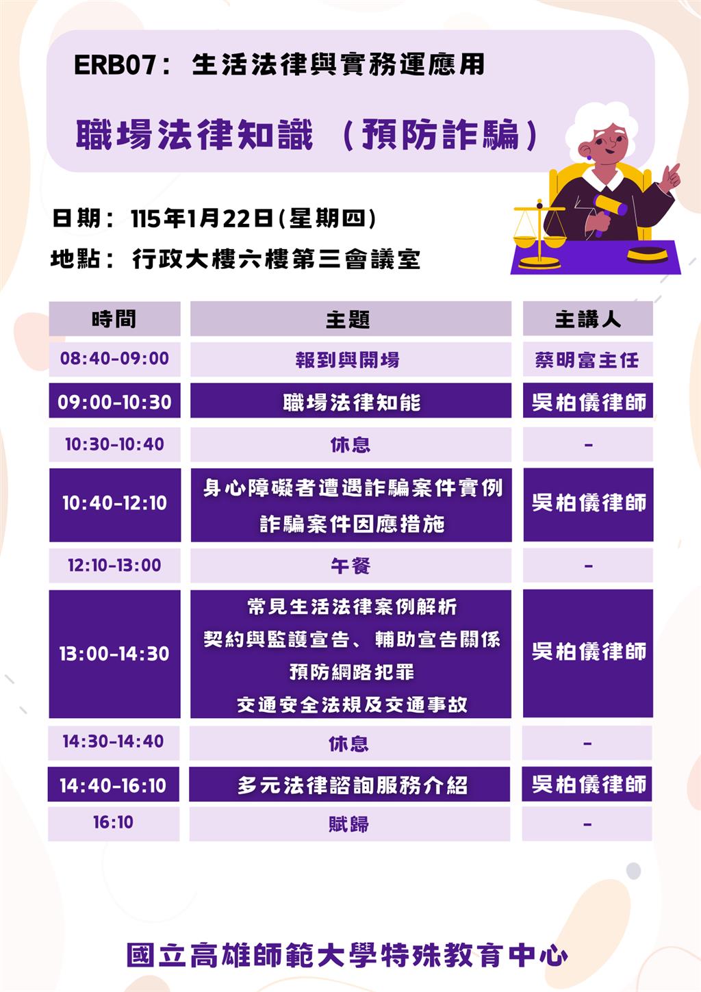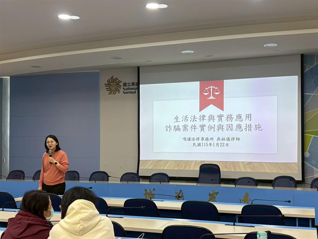 115年1月22日辦理「生活法律與實務應用—職場法律知識預防詐騙」研習,本中心鳴謙法律事務所吳柏儀律師擔任講師,本研習旨增進大專校院資源教室輔導人員對於職場法律常識的認識,以協助並輔導學生預防職場詐騙,以及更了解執行職務不法侵害預防知能。本次研習地點在國立高雄師範大學(和平校區)行政大樓十樓國際會議廳,共有65人報名參加、錄取64、實到63人。