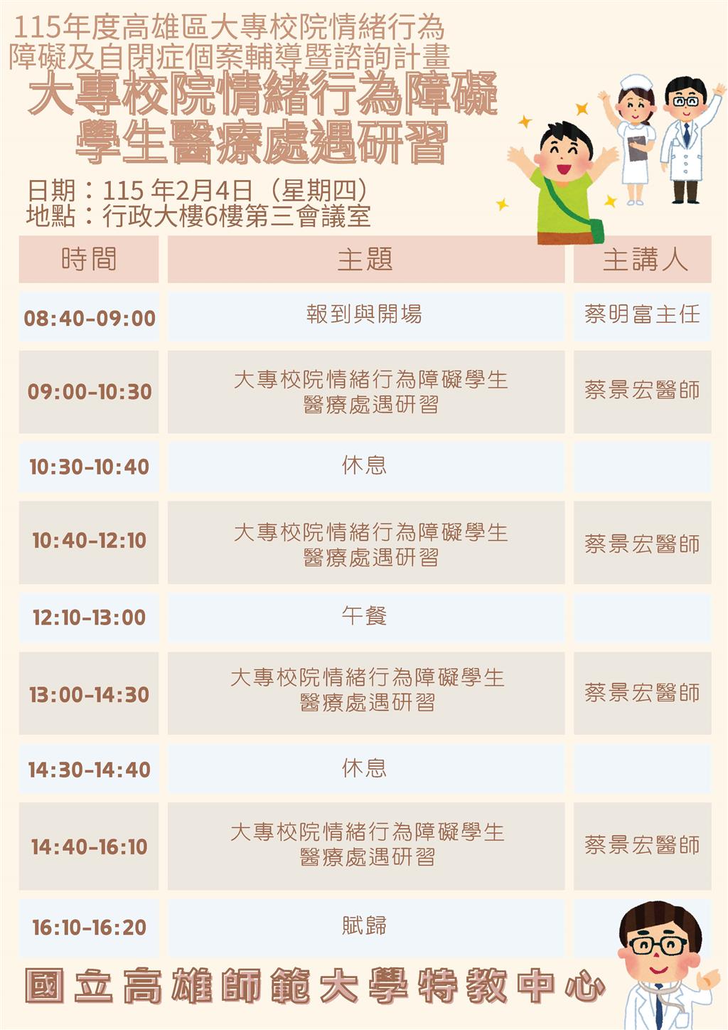 1. 115年2月4日辦理「大專校院情緒行為障礙學生醫療處遇研習」,本中心邀請高雄市立凱旋醫院兒童及青少年精神科主任蔡景宏醫師擔任講師。本研習旨在提升資源教室輔導人員對情緒行為障礙學生特質及其醫療協助策略的認識,並透過實務個案分享,強化對大專情障學生的輔導與協助效率。