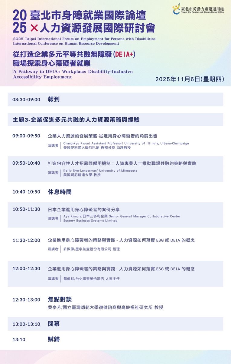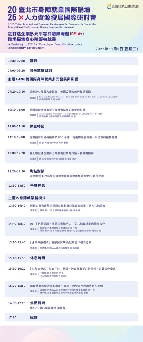 🌏【2025年臺北市身障就業國際論壇 × 人力資源發展國際研討會】從打造企業多元平等共融無障礙(DEIA+)職場探索身心障礙者就業
