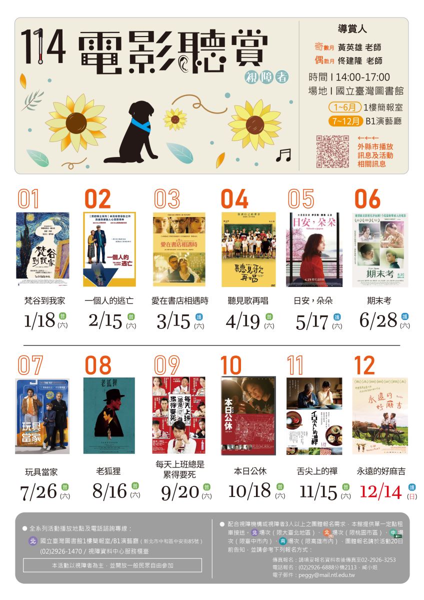 辦理視覺障礙者電影聽賞活動,提供視障者多元社會參與管道,豐富其生活內涵並促其融入社會,藉此改變大家對於「障礙」的看法,讓更多視障者及社會大眾體驗不同的閱聽感受,落實公共圖書館提供視障者公平聽閱權益及資訊接收機會之目標。