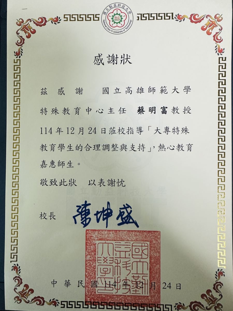 文藻外語大學 特殊教育推行委員會專家委員聘書