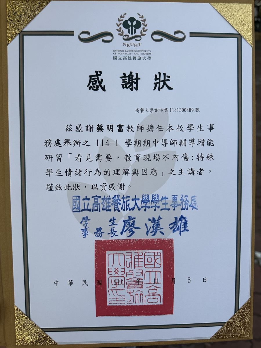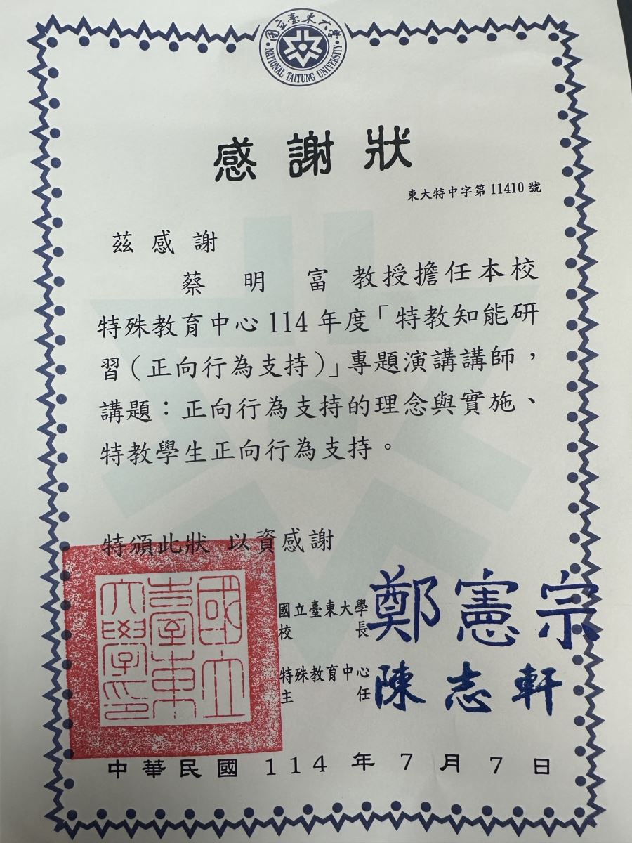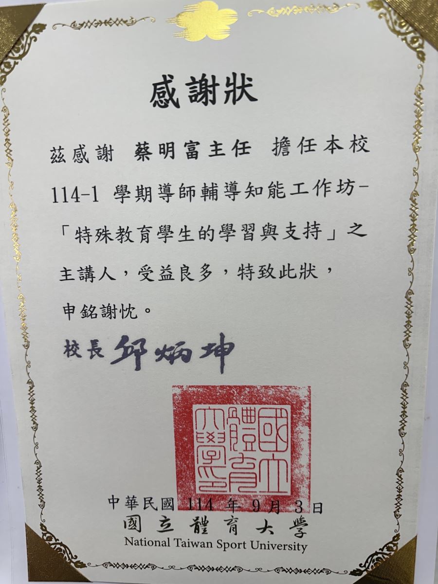 高師大特教中心承辦「大專校院情緒行為障礙及自閉症個案輔導暨諮詢計畫」,積極推動全國與高雄區大專校院教職輔導人員對情緒行為障礙及自閉症學生之教學知能提升與經驗交流,並受邀前往多所校院辦理主題講座、輔導員增能與交流活動,強化校園支持系統建構與跨單位合作。感謝合作學校之肯定與鼓勵,提供本中心寶貴的交流機會。