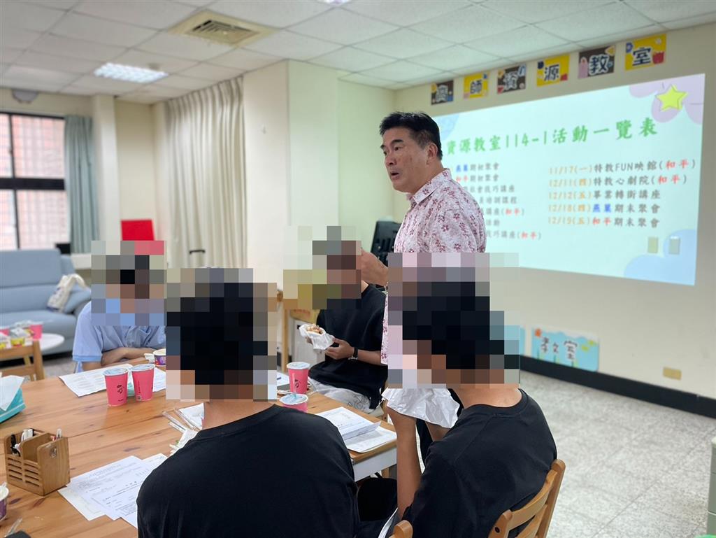 特教中心蔡明富主任亦親自出席,勉勵同學積極參與資源教室各項活動,善用資源並互相支持,現場同學也彼此交流課程經驗,整體氛圍融洽。