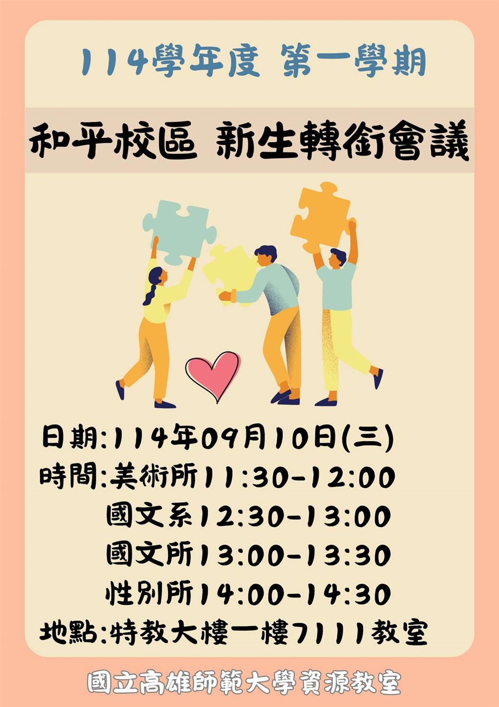 為協助大一新鮮人在高師大順利開啟大學新生活,和平校區共召開5場次的新生轉銜會議,分別有視設系、音樂系、特教系、地理系的系主任、導師及家長、學生共同參加。資源教室輔導員在會議前運用特蒐四表單及SBASA量表了解學生能力現況,會議中進行特教需求說明,在特教中心蔡主任的主持下,讓系所、資源教室、學生及家長三方可以建立初步溝通橋梁,銜接大專所需支持協助。