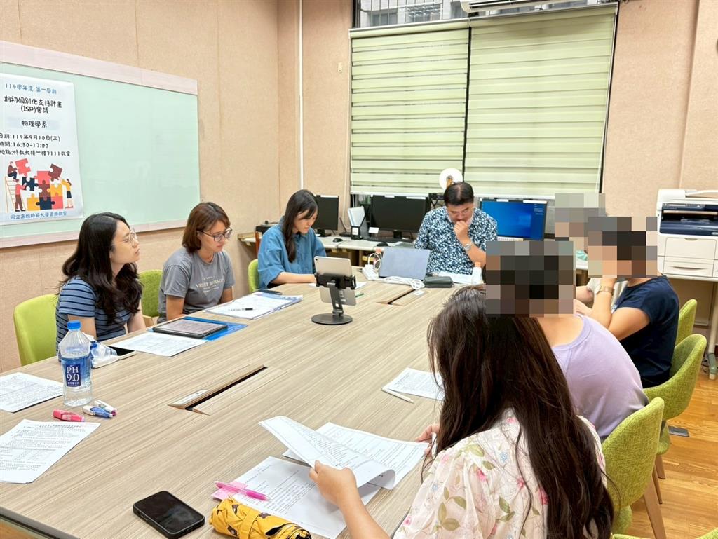 資源教室於和平校區舉行六場次個別化支持計畫會議,參與系所包含美術系、國文系、特教系、物理系,由特教中心蔡明富主任主持,邀請系主任、導師、資源教室輔導員、學生及家長共同出席。