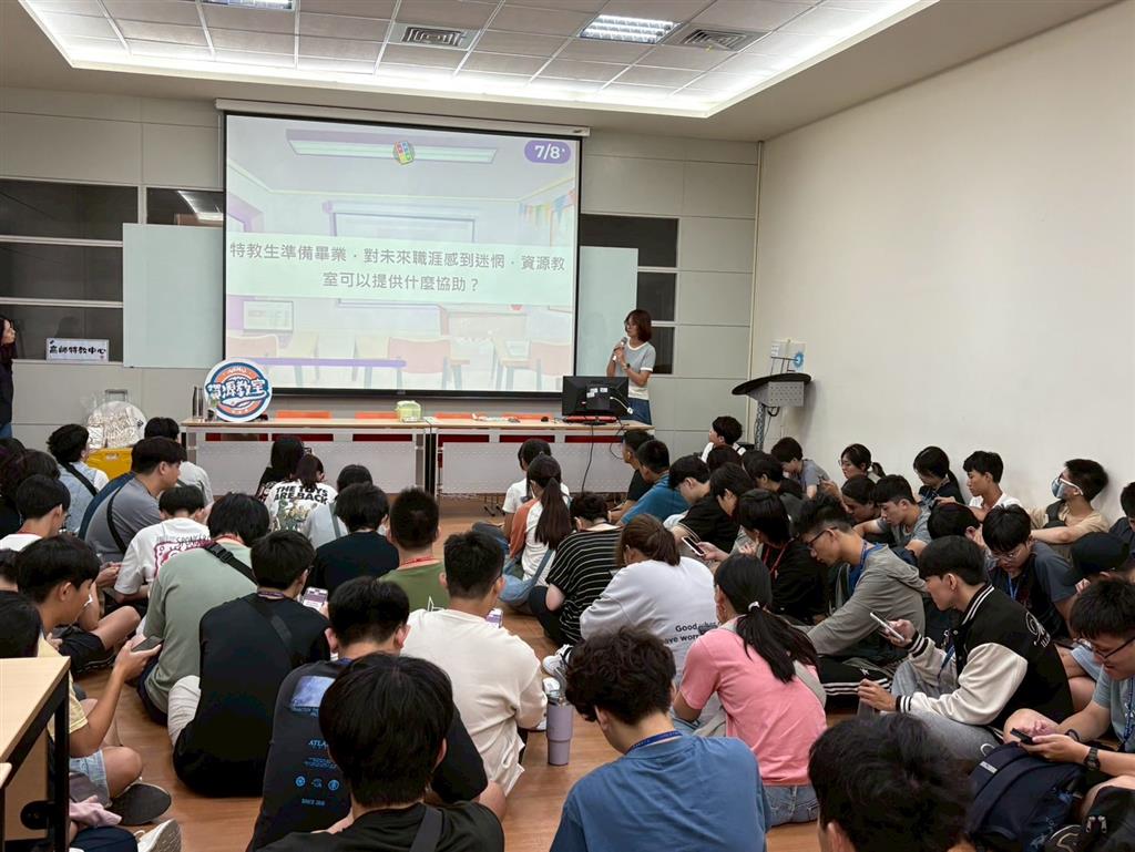 活動中,資源教室輔導員向同學說明特教中心與資源教室的地理位置,主要任務是協助身心障礙學生順利融入校園生活,無論是在課業、生活、職涯發展或心理支持等層面,提供實質的服務與資源。現場也特別分享近兩年獲得總統教育獎的學生故事,讓同學們了解,儘管身心障礙學生在學習與生活中可能面臨挑戰,但只要有適切的支持與自身努力,仍能發揮潛能、創造卓越表現。