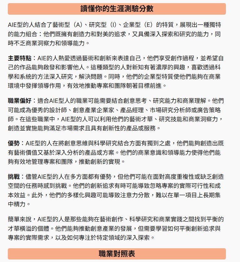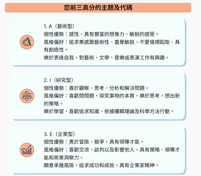 💡測驗目的:職業興趣測驗可以幫助你有效率的向內探索,找出自己潛藏的優勢及職業方向。