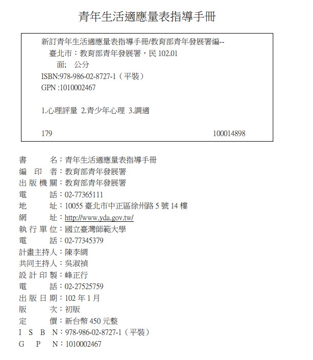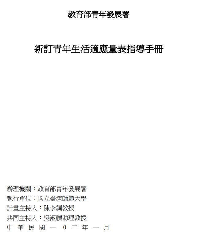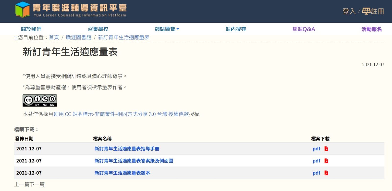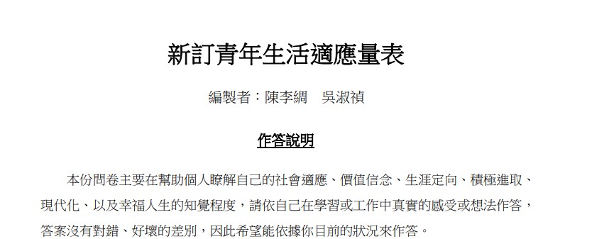 💡測驗目的:了解青年生活適應心理指標,協助青年瞭解自己的適應問題與適應能力,作為未來生涯規劃與發展之參考。