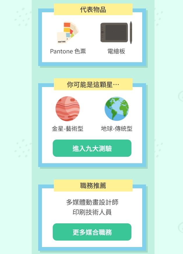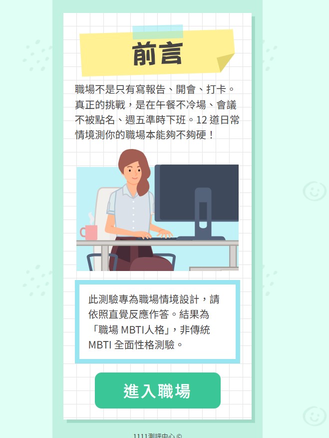 登入1111人力銀行,點選下方資訊連結,根據指導語完成12道題目(依直覺選擇)。